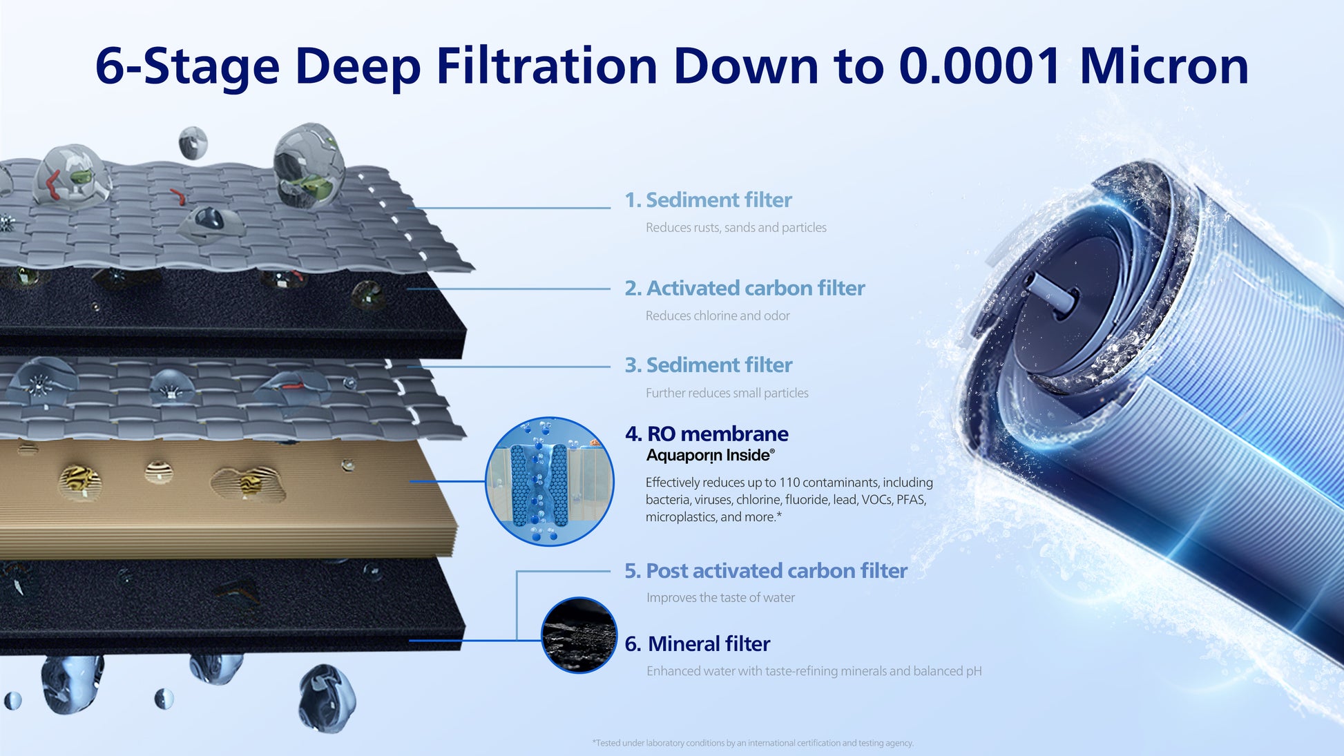 - Reduces TDS, PFAS, Fluoride, Lead, Bacteria, Viruses, Chlorine: This system can effectively remove harmful substances down to 0.0001 micron and is tested by SGS to remove a minimum of 110 harmful contaminants that may exist in your tap water.